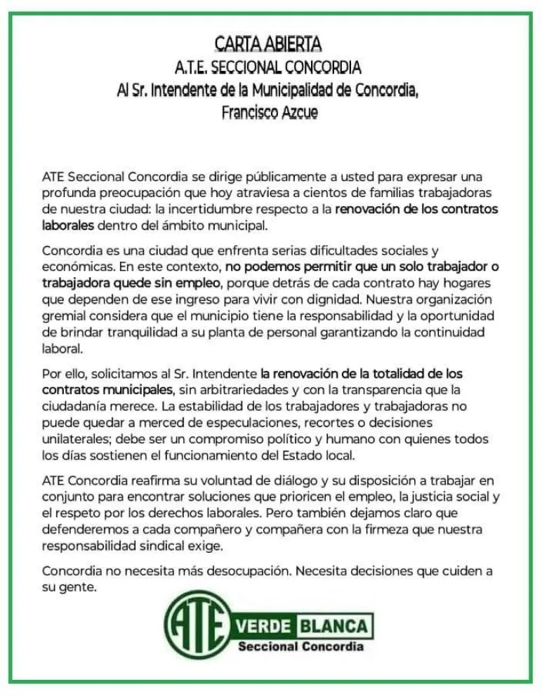 A través de un comunicado público, ATE Seccional Concordia expresó su preocupación al intendente Francisco Azcué, señalando que la incertidumbre sobre la renovación de contratos afecta directamente a “cientos de familias trabajadoras de nuestra ciudad”.
